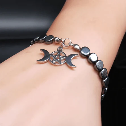 This bracelet features hematite beads and a stainless steel pentagram charm. Hematite is one of the most abundant minerals on Earth's surface and in the shallow crust. It is also excellent for healing the body because it cleanses the blood and supports circulation, making it a must-have in your healing crystal tool kit.