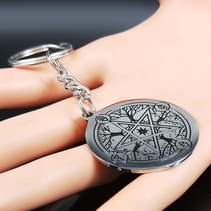 This keychain features the symbol of the pentagram, which represents the union of the spirit with the elements (water, earth, air, and fire), with the tree of life, a symbol of life, and a balance between materiality and spirituality.Â